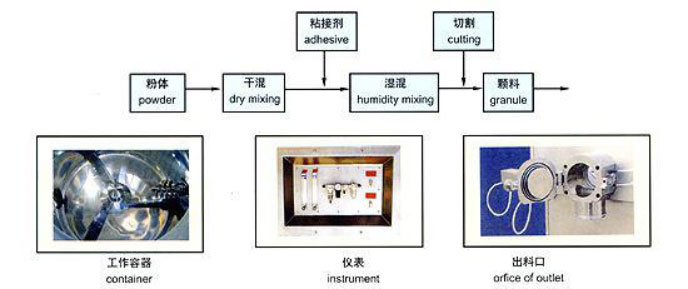 粉體物料與粘合劑在圓筒(錐形)形容器中,由底部混合漿充分混合成濕潤軟材,然后由側(cè)置的高速粉碎槳切割成均勻的濕顆粒。