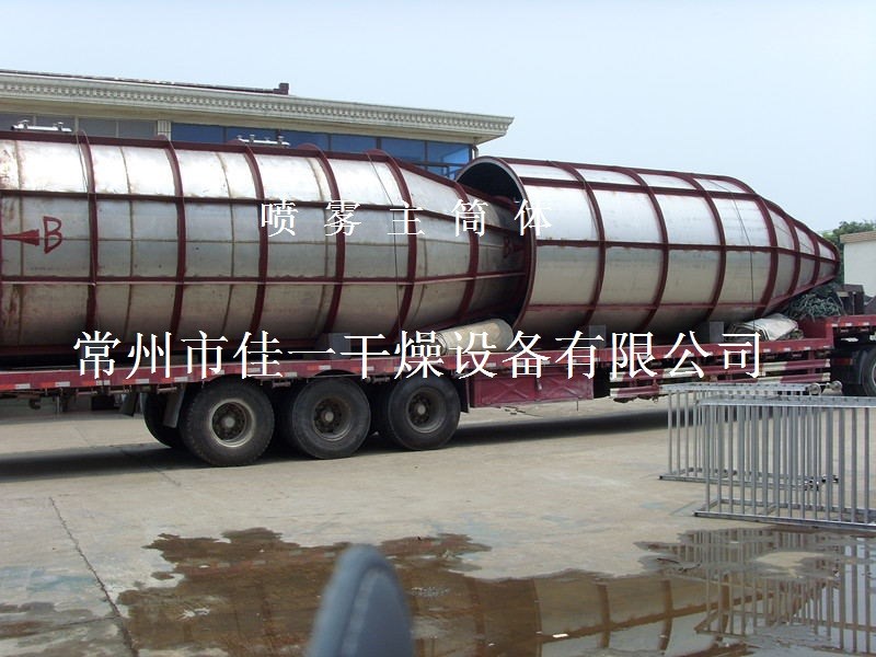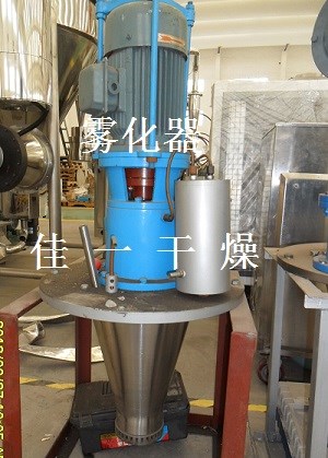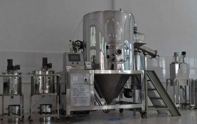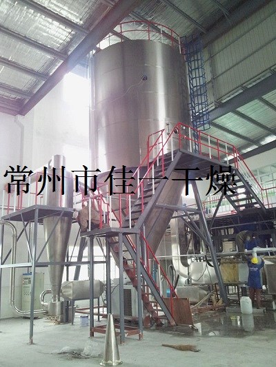 空氣經過濾和加熱,進入干燥器頂部空氣分配器,熱空氣呈螺旋狀均勻地進入干燥室。料液經塔體頂部的高速離心霧化器,(旋轉)噴霧成極細微的霧狀液珠,與熱空氣并流接觸在極短的時間內可干燥為成品。成品連續地由干燥塔底部和旋風分離器中輸出,廢氣由風機排空。
