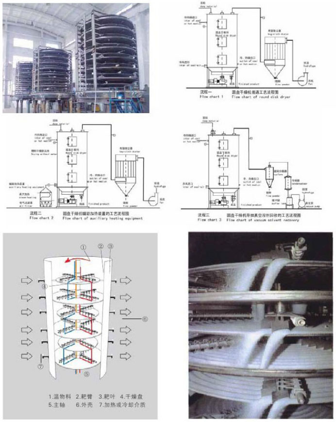 濕物料自加料器連續地加到干燥器上部第一層干燥盤上,帶有耙葉的耙臂作回轉運動使耙臂作回轉運動使耙葉連續地翻抄物料。物料沿指數螺旋線流過干燥盤表面,在小干燥盤上的物料被移送到外緣,并在外緣落到下方的大干燥盤外緣,在大干盤上物料向里移動并從中間落料口落如下一層小干燥盤中。大小干燥盤上下交替排列,物料得以連續地流過整個干燥器。中空的干燥盤內通入加熱介質,加熱介質形式有飽和蒸汽、熱水和導熱油,加熱介質由干燥盤的一端進入,從另一端導出。已干物料從最后一層干燥盤落到殼體的底層,最后被耙葉移送到出料口排出。濕份從物料中逸出,由設在頂蓋上的排濕口排出,真空型盤式干燥器的濕氣由設在頂蓋上的真空泵口排出。從底層排出的干物料可直接包裝。通過配加翅片加熱器、溶劑回收冷凝器、袋式除塵器、干料返混機構、引風機等輔機,可提高其干燥的生產能力,干燥膏糊狀和熱敏性物 料,可方便地回收溶劑,并能進行熱解和反應操作。