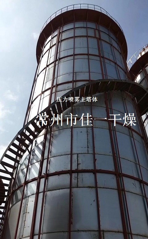本機組工作過程為料液通過隔膜泵高壓輸入,噴出霧狀液滴,然后同熱空氣并流下降,大部分粉粒由塔底排料口收集,廢氣及其微小粉末經旋風分離器分離,廢氣由抽風機排出,粉末由設在旋風分離器下端的授粉筒收集,風機出口還可裝備二級除塵裝置,回收率在96-98%以上。