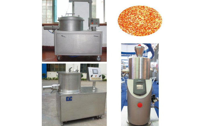 本機是通過設置旋轉離心盤、鼓風機、氣動噴槍,將濕顆粒制成美麗的球丸。將前道工序做成的濕顆粒投入旋轉離心盤 內,啟動鼓風機后再將旋轉離心盤啟動,使濕顆粒受到環隙空氣浮力、旋轉離心力、自身重力作用,呈環周繩股狀運動, 從而形成真球度極高的球丸。