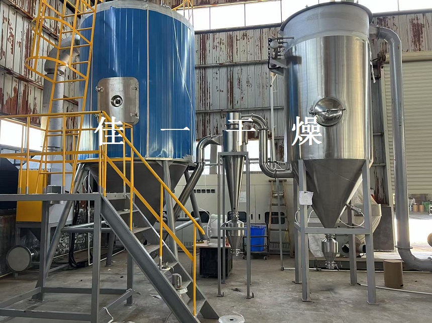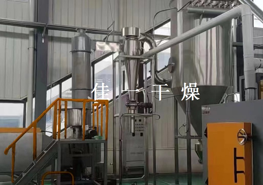 熱空氣切線進(jìn)入干燥器底部,在攪拌器帶動(dòng)下形成強(qiáng)有力的旋轉(zhuǎn)風(fēng)場(chǎng)。膏狀物料由螺旋加料器進(jìn)入干燥器內(nèi),在高速旋轉(zhuǎn)攪拌槳的強(qiáng)烈作用下,物料受撞擊、磨擦及剪切力的作用下得到分散,塊狀物料迅速破碎,與熱空氣充分接觸、受熱、干燥。脫水后的干物料隨熱氣流上升,分級(jí)環(huán)將大顆粒截留,小顆粒從環(huán)中心排出干燥器外,由旋風(fēng)分離器和除塵器回收,未干透或大塊物料受離心力作用甩向器壁,重新落到底部被破碎干燥。